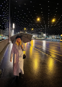 This evening, the city was quite calm. Rain was pouring from the dark sky, and festive lights were lit around the bridges and houses.